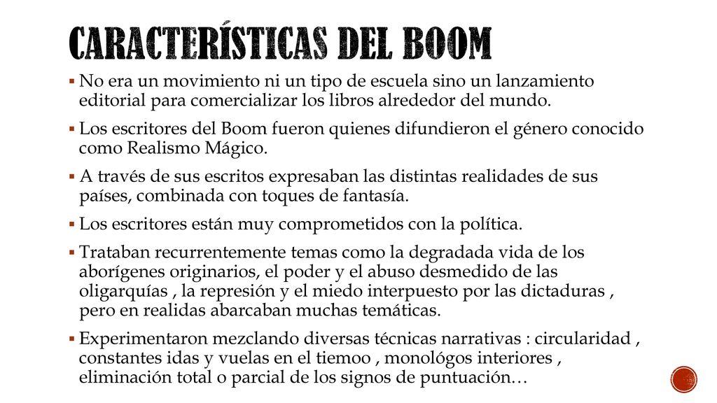 Una de las características más destacadas de este periodo es que, una gran mayoría de autores latinoamericanos, escribieron bajo la influencia de realismo mágico, un tipo de narrativa inaugurada con "Cien años de soledad" de García Márquez y que se mueve entre el plano de la realidad y la fantasía por partes iguales. Los autores comenzaron a usar este tipo de subgénero para poder explicar cómo era la realidad socia en sus países, una manera poética y literaria de explicar tanto de forma real como metafórica, lo que sucedía en sus ciudades.